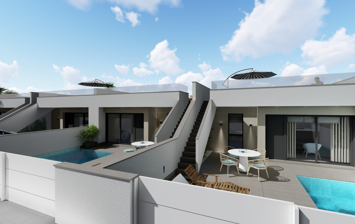 A modern, 2 hálószobás, 2 fürdőszobás egyszintes villák vételára tetőterasszal 215.900 EUR - 259.900 EUR között található a nagyságtól és modelltől függően.
